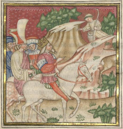 Kassel, Universitätsbibliothek Kassel, Landesbibliothek und Murhardsche Bibliothek der Stadt Kassel, 2° poet. et roman. 3, f. 88v. La dea Diana appare al re Felice durante una battuta di caccia al cervo.