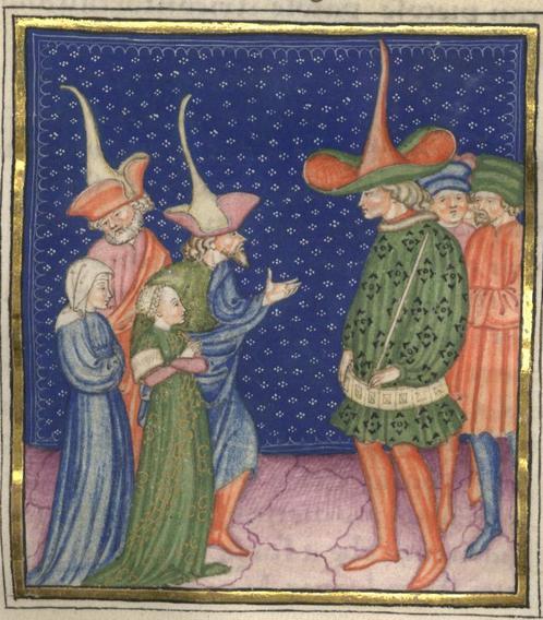 Kassel, Universitätsbibliothek Kassel, Landesbibliothek und Murhardsche Bibliothek der Stadt Kassel, 2° poet. et roman. 3, f. 95r. Una volta sbarcati, i mercanti presentano Biancifiore all'ammiraglio di Alessandria.