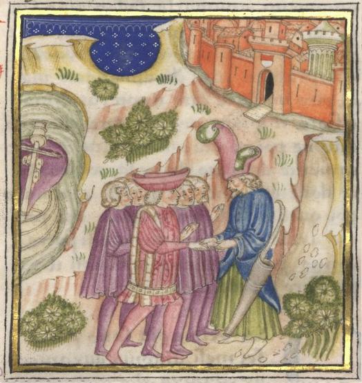 Kassel, Universitätsbibliothek Kassel, Landesbibliothek und Murhardsche Bibliothek der Stadt Kassel, 2° poet. et roman. 3, f. 139r. Sbarcati ad Alessandria, Filocolo e i suoi compagni incontrano Dario, un caro amico di Bellisano.