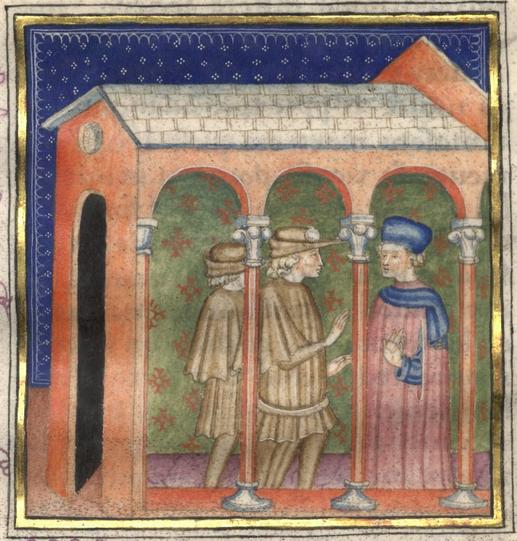 Kassel, Universitätsbibliothek Kassel, Landesbibliothek und Murhardsche Bibliothek der Stadt Kassel, 2° poet. et roman. 3, f. 195r. Filocolo e Menedon si recano nuovamente in Laterano da Ilario.