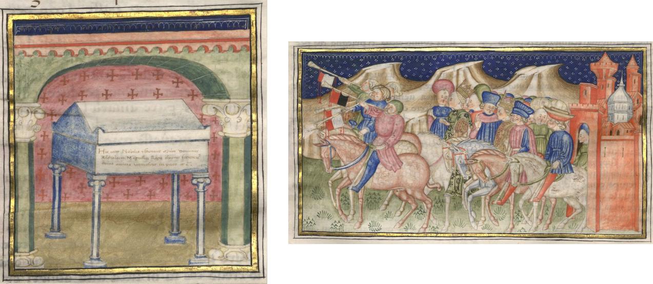 Kassel, Universitätsbibliothek Kassel, Landesbibliothek und Murhardsche Bibliothek der Stadt Kassel, 2° poet. et roman. 3, f. 201v. La carta presenta due miniature: la tomba di Ascalion in Laterano con un epitaffio inciso sopra; il corteo di Florio e Biancifiore lascia Roma accompagnato da Ilario per dirigersi verso Marmorina.