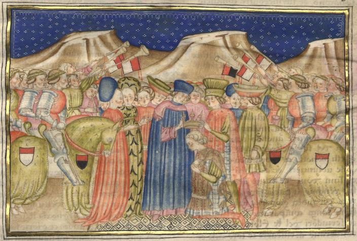 Kassel, Universitätsbibliothek Kassel, Landesbibliothek und Murhardsche Bibliothek der Stadt Kassel, 2° poet. et roman. 3, f. 209r. Florio viene incoronato da Ilario e Feramonte alla presenza di una folla di dame e cavalieri.