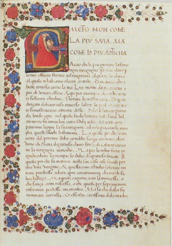Berlino, Staatsbibliothek – Preußischer Kulturbesitz, Hdschr. 370, f. 29r. Ritratto di profilo a mezzobusto dell'autore Giovanni Boccaccio, all'interno dell'iniziale figurata A(meto).