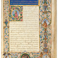 Collezione privata (già Milano, collezione eredi Trivulzio, 2142), f. 1r. Ritratto di profilo dell'autore Giovanni Boccaccio con un libro, all'interno dell'iniziale figurata S(uole); nel fregio decorativo sono presenti lo stemma della famiglia Trivulzio (in basso) e tre medaglioni polilobati in cui sono raffigurati rispettivamente due personaggi maschili ed un personaggio femminile (Fiammetta?).