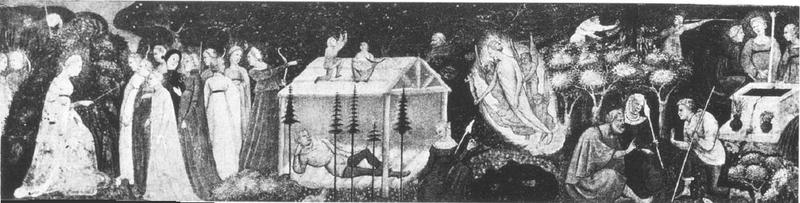 già New York, M. Roy Fisher Fine Arts Inc. Sono raffigurati alcuni episodi del Ninfale fiesolano: Africo assiste di nascosto alle ninfe che rinnovano il voto di castità a Diana, e si innamora alla vista di Mensola; Venere appare in sogno ad Africo; i genitori di Africo tentano di dissuadere il figlio dal recarsi dalle ninfe; Mensola scaglia un dardo contro Africo (in alto); Africo si avvicina alle ninfe riunite presso una fonte (qui raffigurata come una fontana).