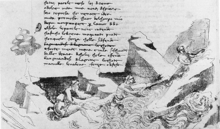 Firenze, Biblioteca Nazionale Centrale, B. R. 47, f. 109v. Africo tenta di insidiare Mensola durante il bagno alla fonte.