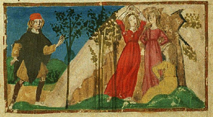 Firenze, Biblioteca Riccardiana, Ricc. 1503, f. 16r. Il copista del manoscritto, datato 1482, è Nicola Mangona. Africo si avvicina a tre ninfe.