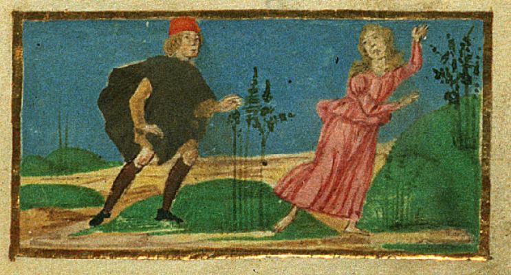 Firenze, Biblioteca Riccardiana, Ricc. 1503, f. 27r. Il copista del manoscritto, datato 1482, è Nicola Mangona. Mensola fugge impaurita da Africo.