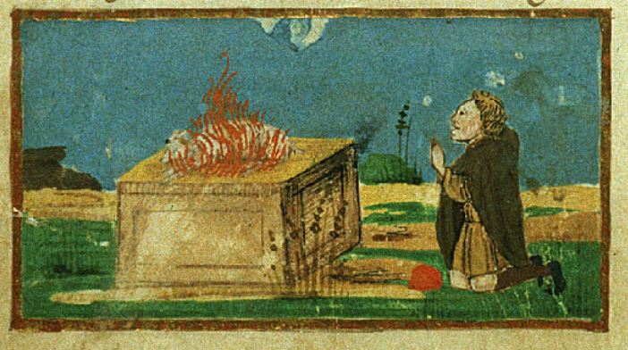 Firenze, Biblioteca Riccardiana, Ricc. 1503, f. 47v. Il copista del manoscritto, datato 1482, è Nicola Mangona. Africo offre una pecora in sacrificio a Venere.