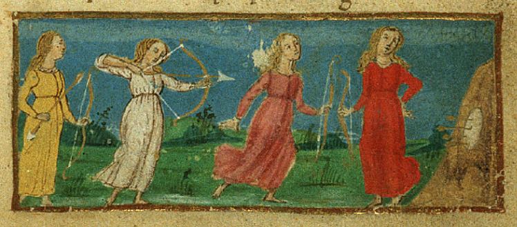 Firenze, Biblioteca Riccardiana, Ricc. 1503, f. 57r. Il copista del manoscritto, datato 1482, è Nicola Mangona. Africo eccelle nella gara di tiro con l'arco disputata con le ninfe.