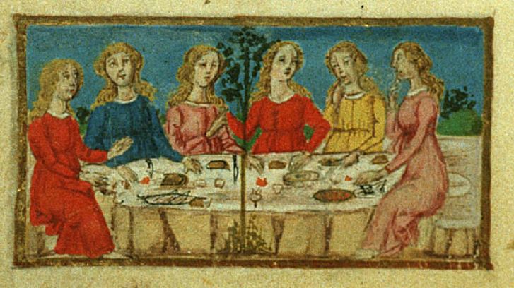 Maestro del Ninfale (1482), Africo e le ninfe siedono a banchetto