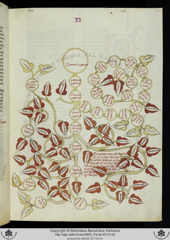 Città del Vaticano, BAV, Pal. lat. 937, f. 70r. Albero genealogico di Dardano.