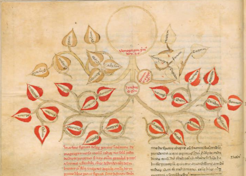 Firenze, Biblioteca Medicea Laurenziana, Plut. 52.9, f. 11v. Manoscritto autografo di Giovanni Boccaccio. Albero genealogico di Demogorgone.
