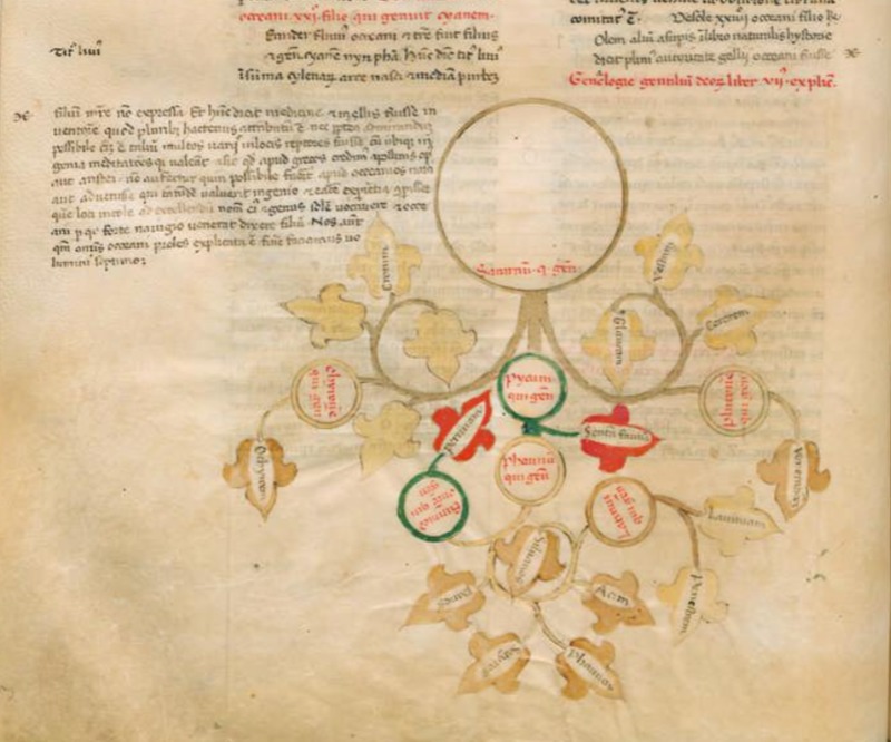Firenze, Biblioteca Medicea Laurenziana, Plut. 52.9, f. 83v. Manoscritto autografo di Giovanni Boccaccio. Albero genealogico di Saturno.