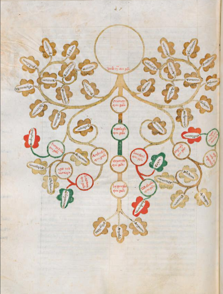 Firenze, Biblioteca Medicea Laurenziana, Plut. 52.9, f. 110v. Manoscritto autografo di Giovanni Boccaccio. Albero genealogico di Giove.