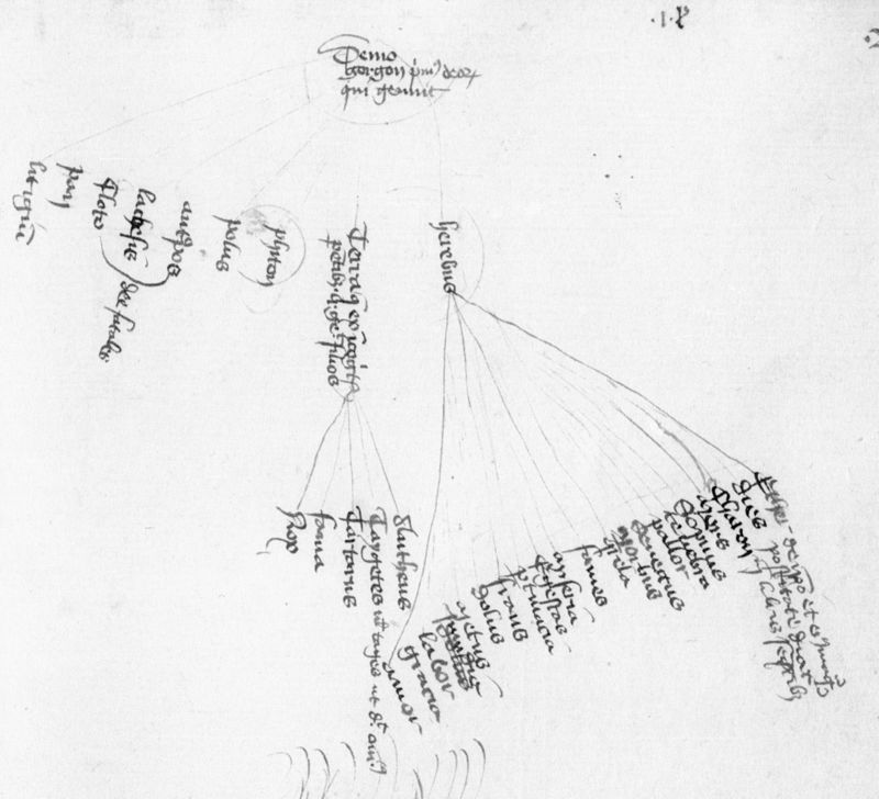 Parigi, Bibliothèque Nationale de France, Lat. 14716, f. 206r. Il copista del manoscritto è Gérard Martel. Albero genealogico di Demogorgone.