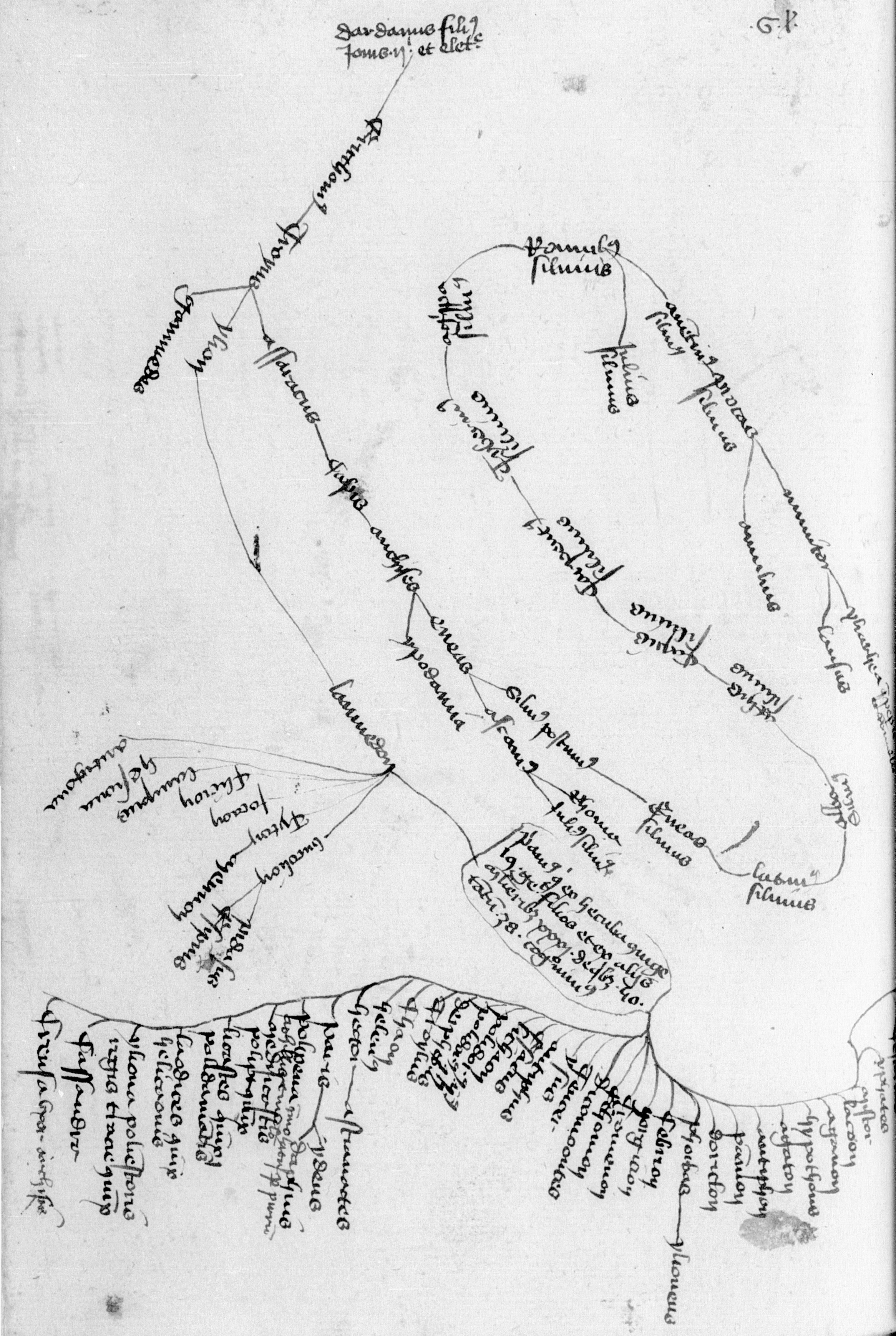 Parigi, Bibliothèque Nationale de France, Lat. 14716, f. 209r. Il copista del manoscritto è Gérard Martel. Albero genealogico di Oceano.