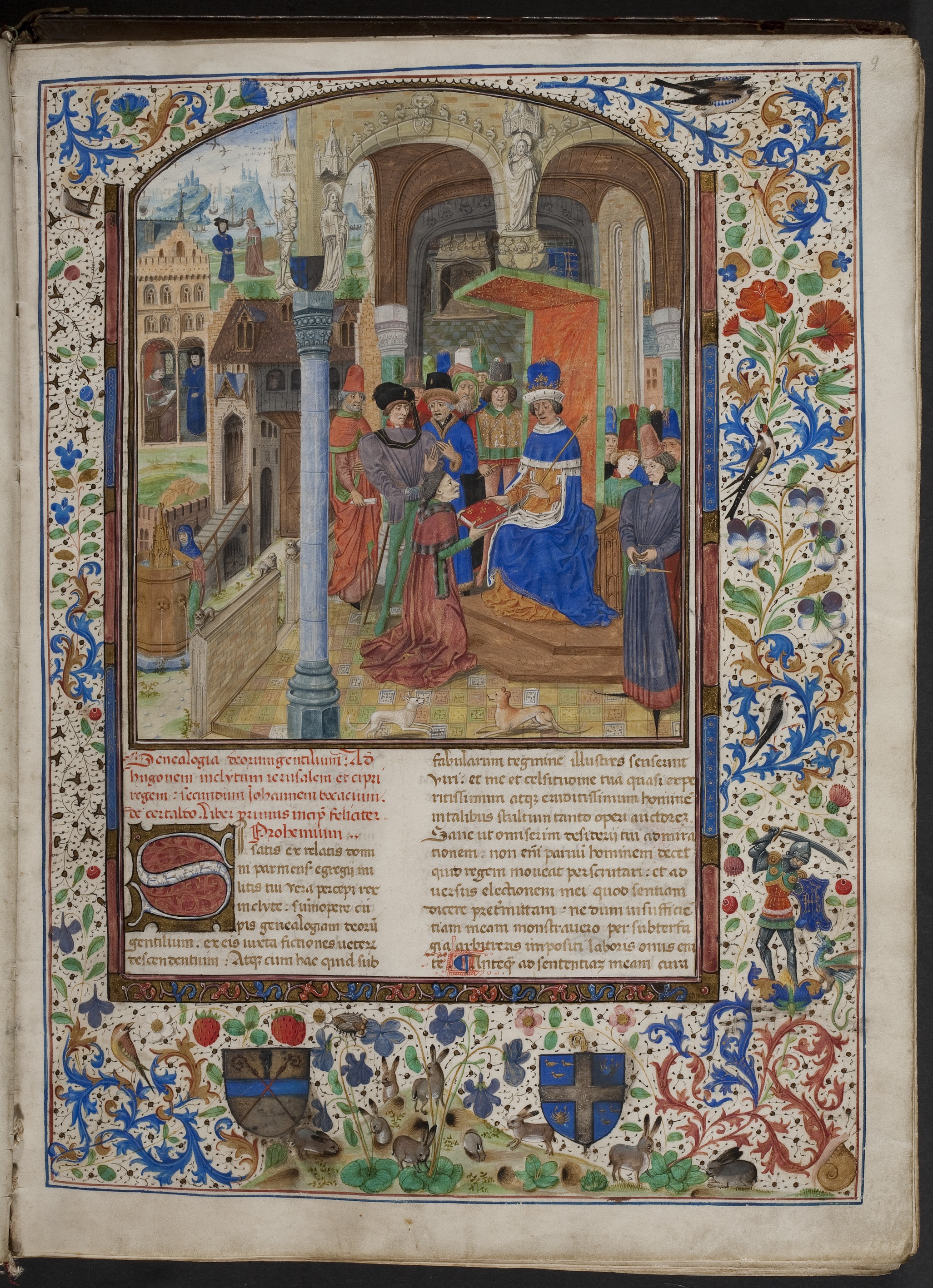 Bruges, Bibliotheek van het Grootseminarie, 154/44, f. 9r. L'autore Giovanni Boccaccio presenta il libro a Ugo di Cipro dinanzi agli uomini della corte; raffigurati sulla sinistra sono presenti un vecchio accanto ad una fonte, in un interno un nobile recatosi in visita allo scrittoio di Boccaccio per invitarlo a scrivere, e in lontananza di nuovo Boccaccio ed il suo nobile interlocutore all'aperto; in lontananza sullo sfondo alcune navi solcano la baia.