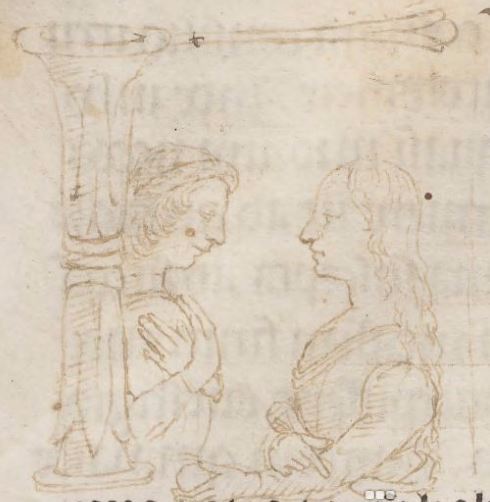 Cambridge (Mass.), Harvard University, Houghton Library, Richardson 41, f. 4v. Piramo e Tisbe raffigurati di profilo, all'interno dell'iniziale figurata T(isbes).