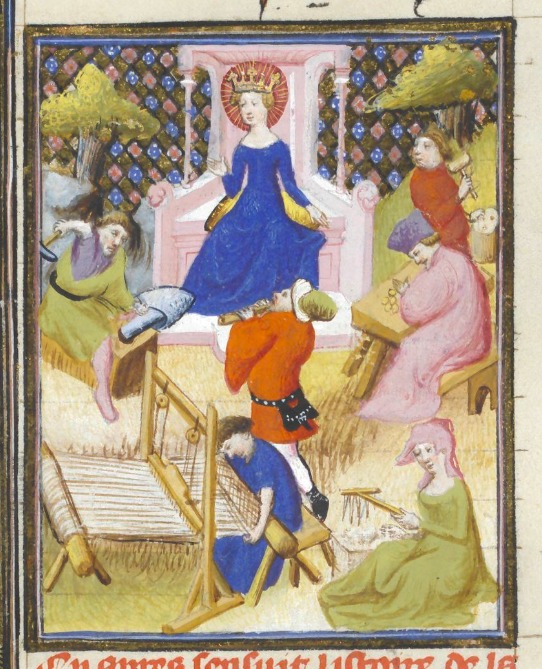Bruxelles, Koninklijke Bibliotheek van België, 9509, f. 15r. La dea Minerva, seduta sul trono, osserva uomini e donne utilizzare le invenzioni che ha donato loro: la tessitura, la cardatura della lana, la fucina, l'olio d'oliva, il calcolo, il flauto.