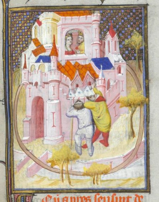 Bruxelles, Koninklijke Bibliotheek van België, 9509, f. 60r. All'interno delle mura di Cartagine, delimitata da una pelle di bue, due uomini si volgono verso l'alto; dalla finestra di un palazzo si vede Enea offrire una mela a Didone (?).