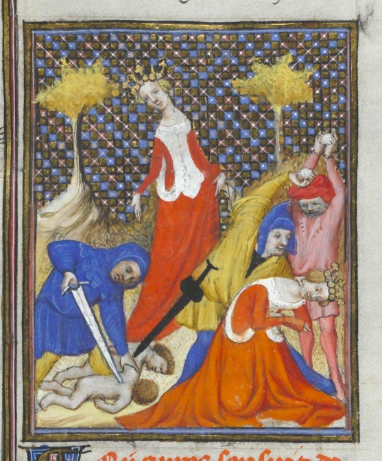 Bruxelles, Koninklijke Bibliotheek van België, 9509, f. 77v. Atalia, regina di Gerusalemme, ordina il massacro di tutti i discendenti maschi della stirpe di David; Atalia viene lapidata da due uomini.
