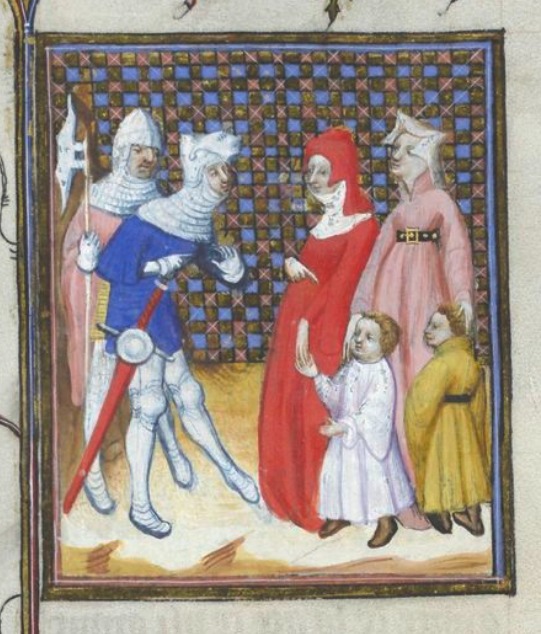 Bruxelles, Koninklijke Bibliotheek van België, 9509, f. 83r. Veturia, accompagnata dalla nuora Volumnia con i due figli, dissuade il figlio Coriolano dal distruggere Roma.