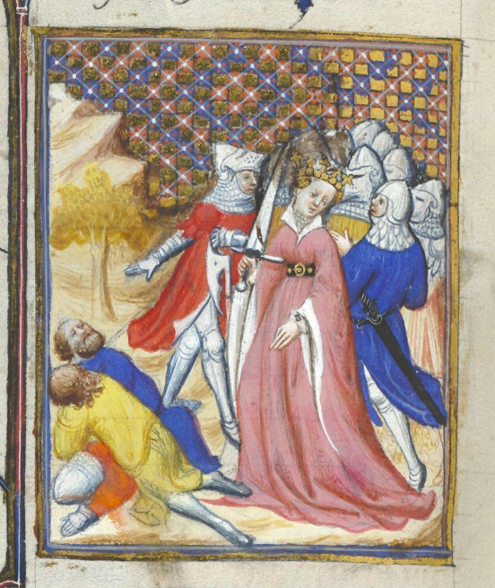 Bruxelles, Koninklijke Bibliotheek van België, 9509, f. 86v. La regina Artemisia, armata di spada, è alla guida del suo esercito.
