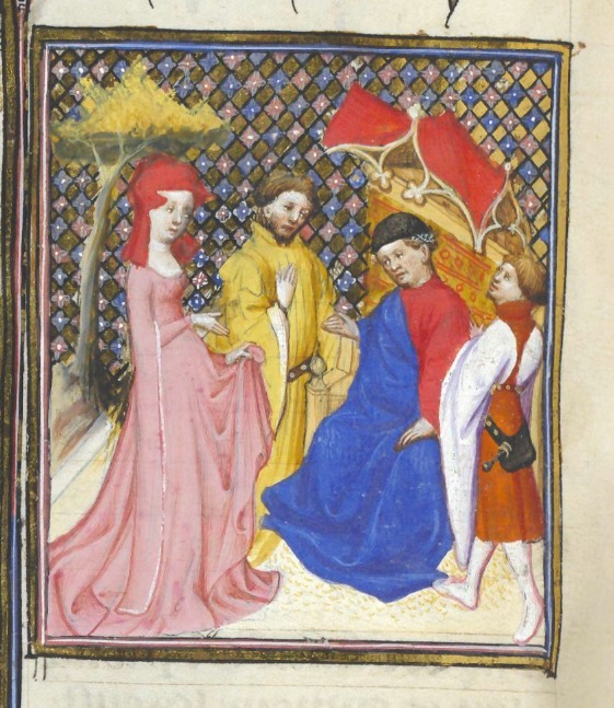 Bruxelles, Koninklijke Bibliotheek van België, 9509, f. 115v. Sempronia, convocata dinanzi al tribuno, si rifiuta di riconoscere il nipote.