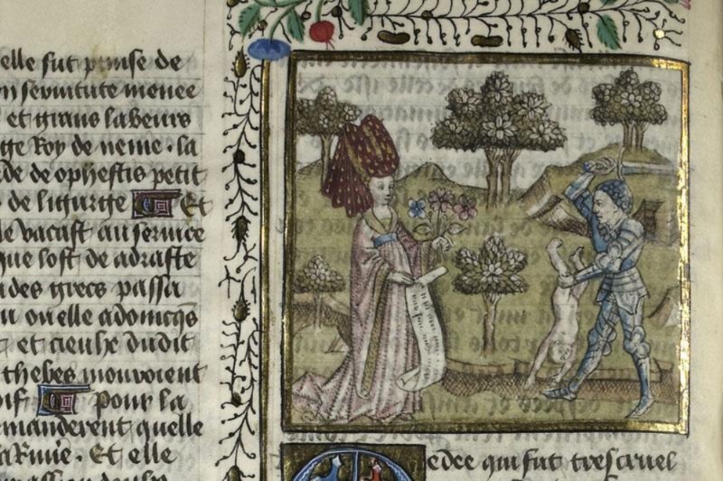 Chantilly, Bibliothèque du Château de Chantilly, 856, f. 46v. Medea, reggendo un mazzo di fiori ed una pergamena tra le mani, assiste mentre Giasone uccide il giovane Apsirto.