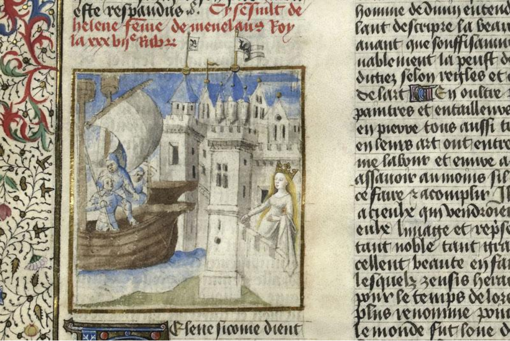 Chantilly, Bibliothèque du Château de Chantilly, 856, f. 61v. Elena dagli spalti di Troia assiste all'arrivo delle navi greche.