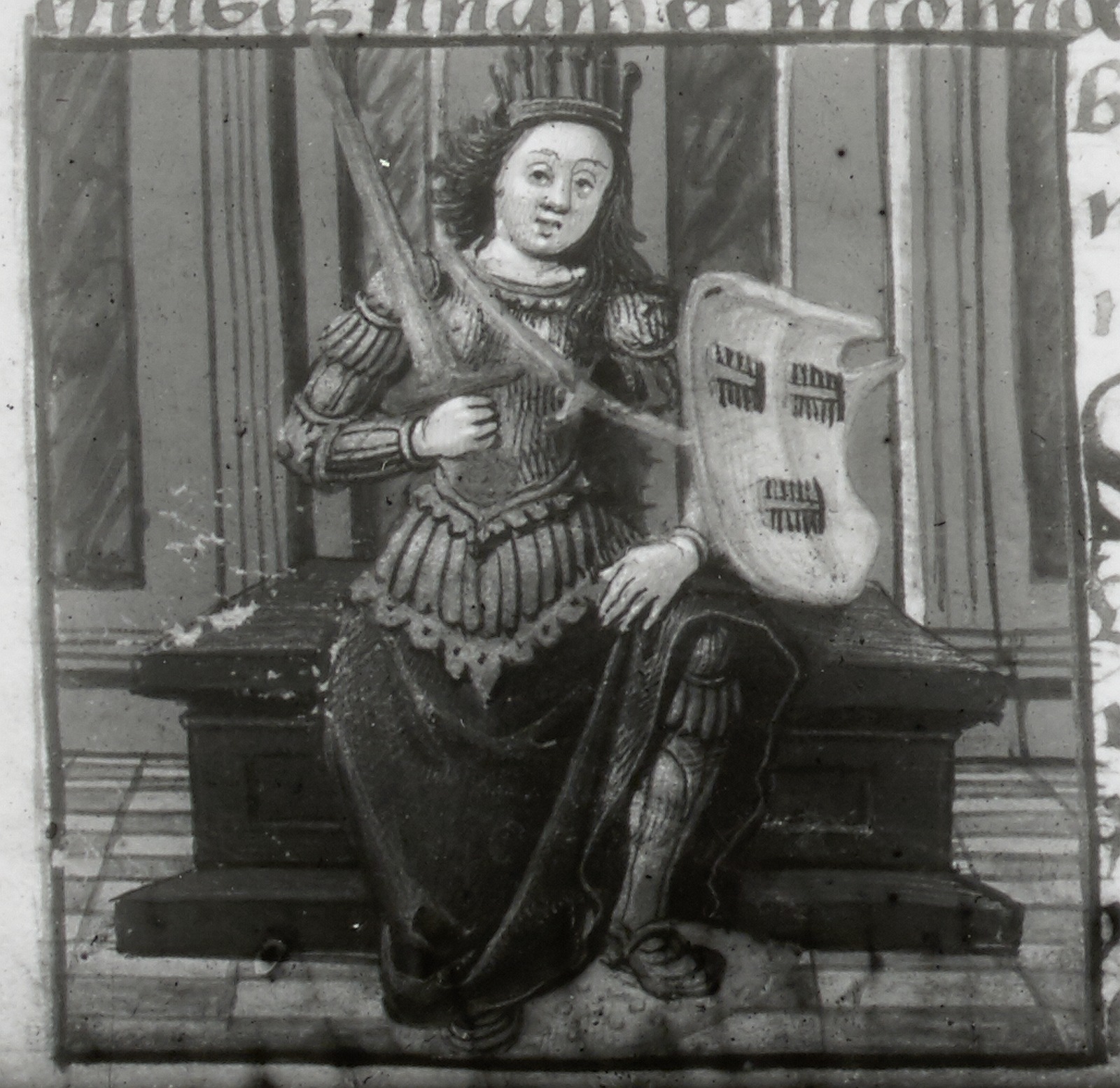 Dresda, Sächsische Landesbibliothek, F 171 b, f. 7r. Semiramide siede sul trono vestita in armatura con una spada e uno scudo.