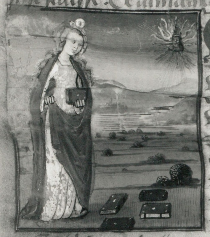 Dresda, Sächsische Landesbibliothek, F 171 b, f. 31r. La sibilla Amaltea, figlia di Helios, con alcuni libri.