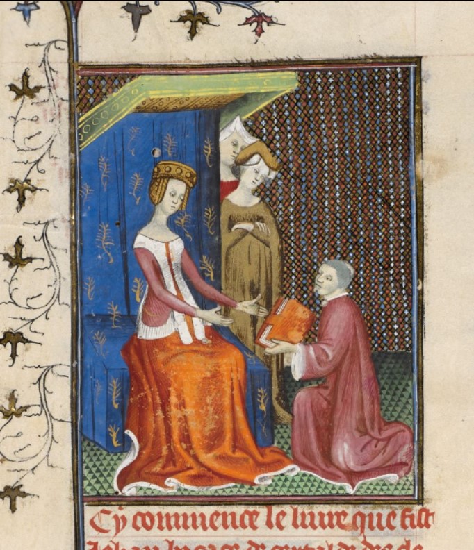 Londra, British Library, Royal 20 C V, f. 2v. L'autore Giovanni Boccaccio offre il libro ad Andrea Acciaiuoli.