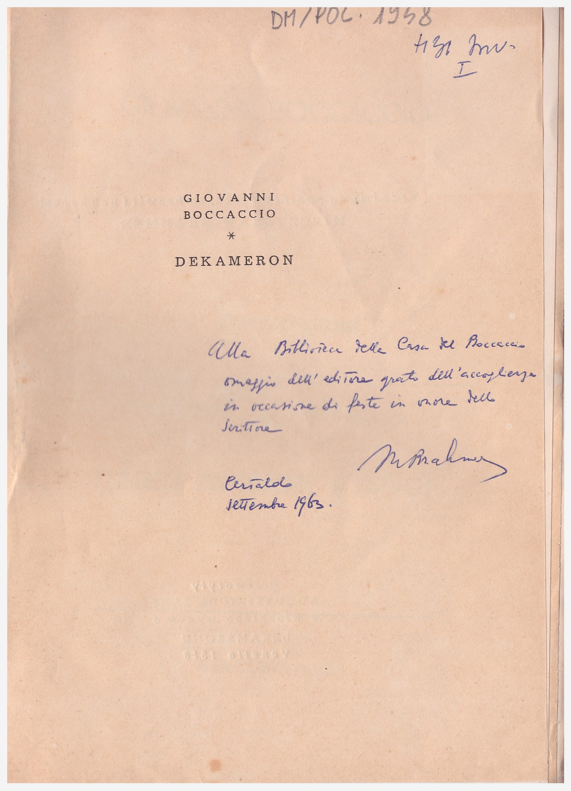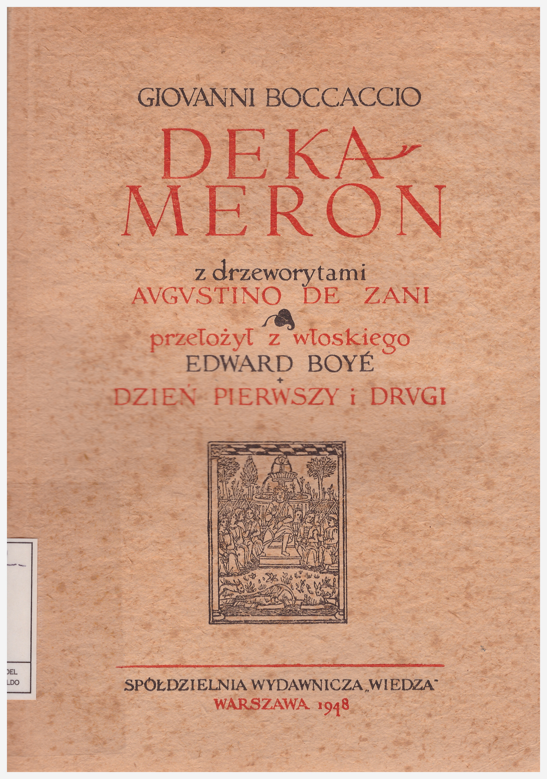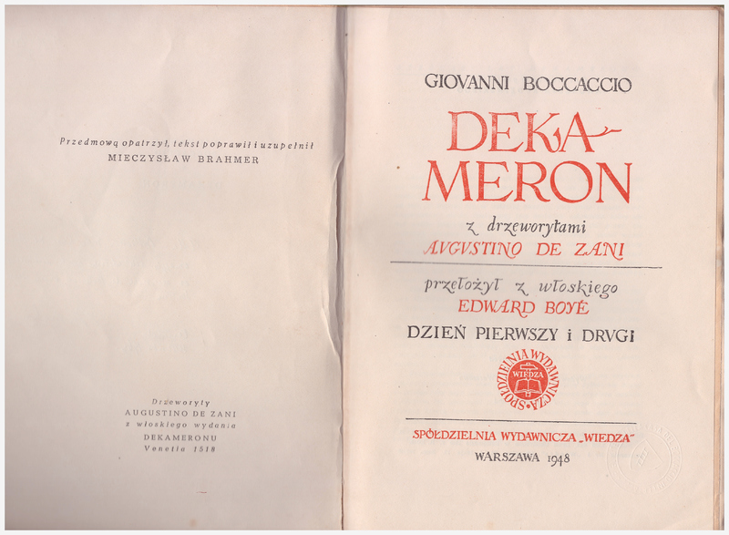 Dekameron. I / z drzeworytami Augustino de Zani ; przełożył z włoskiego Edward Boye ; przedmową opatrzył, tekst poprawił iuzupełnił Mieczyslaw Brahmer