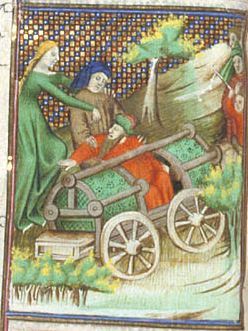 Londra, British Library, Royal 20 C V, f. 98v. Claudia impedisce che suo padre venga gettato giù dal carro trionfale.