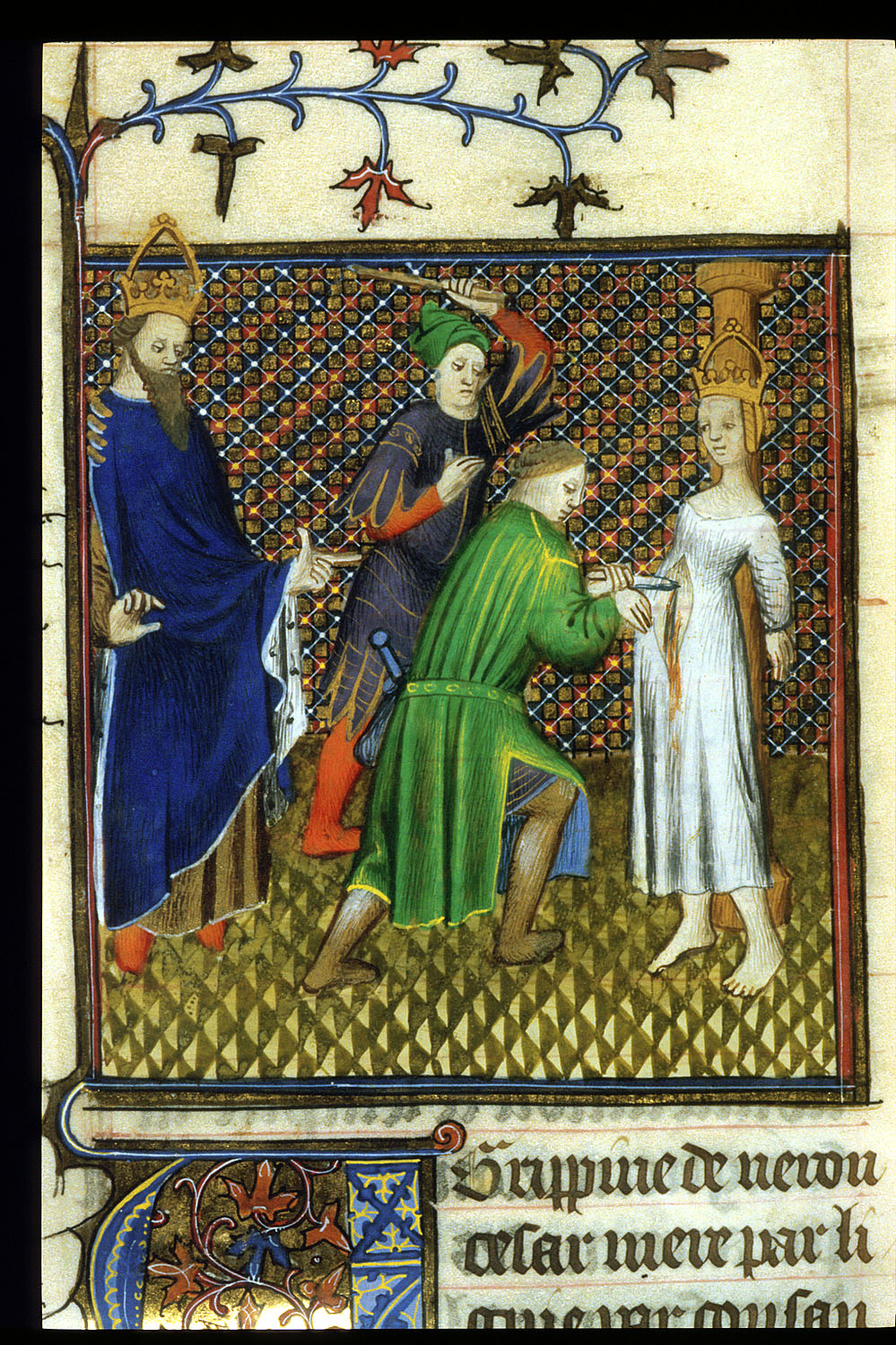 Londra, British Library, Royal 20 C V, f. 139r. Agrippina minore, legata ad una colonna, viene pugnalata a morte dai due sicari inviati dal figlio Nerone, il quale assiste alla scena.