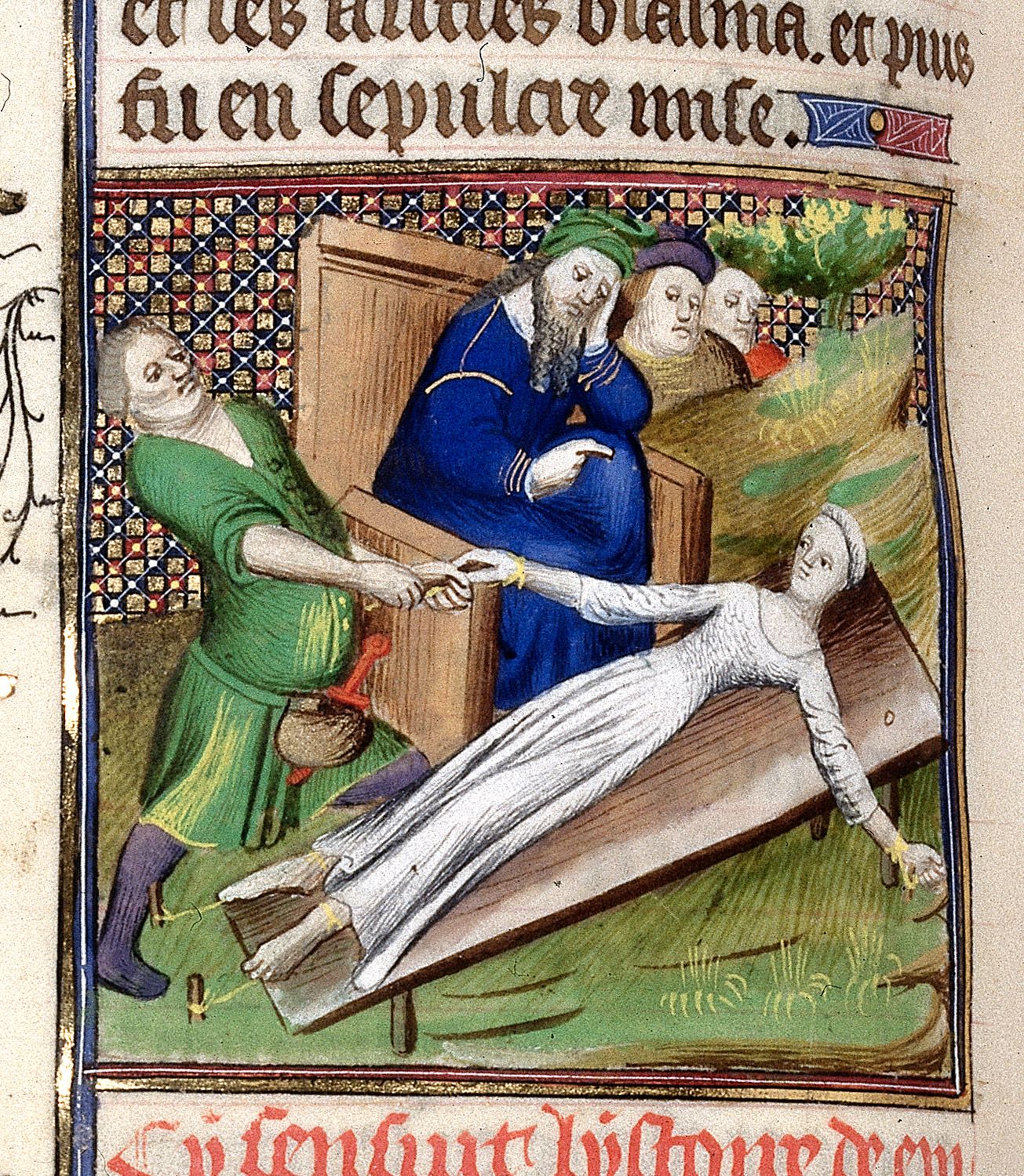 Londra, British Library, Royal 20 C V, f. 141v. Epicari viene torturata per aver preso parte alla congiura contro Nerone.