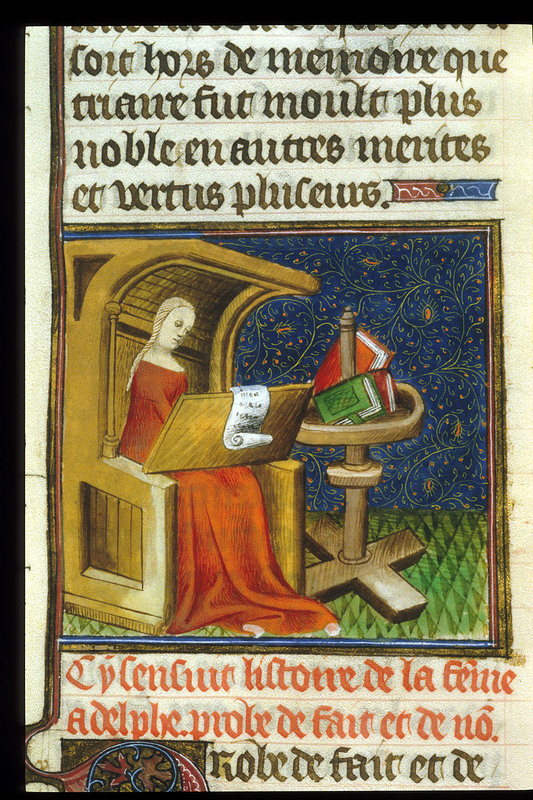 Londra, British Library, Royal 20 C V, f. 147v. Proba seduta in cattedra con i suoi libri.