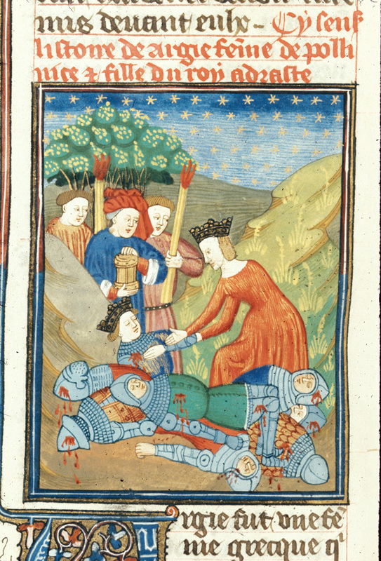Londra, British Library, Royal 16 G V, f. 31v. Argia trova il corpo del marito tra i cadaveri sul campo di battaglia.