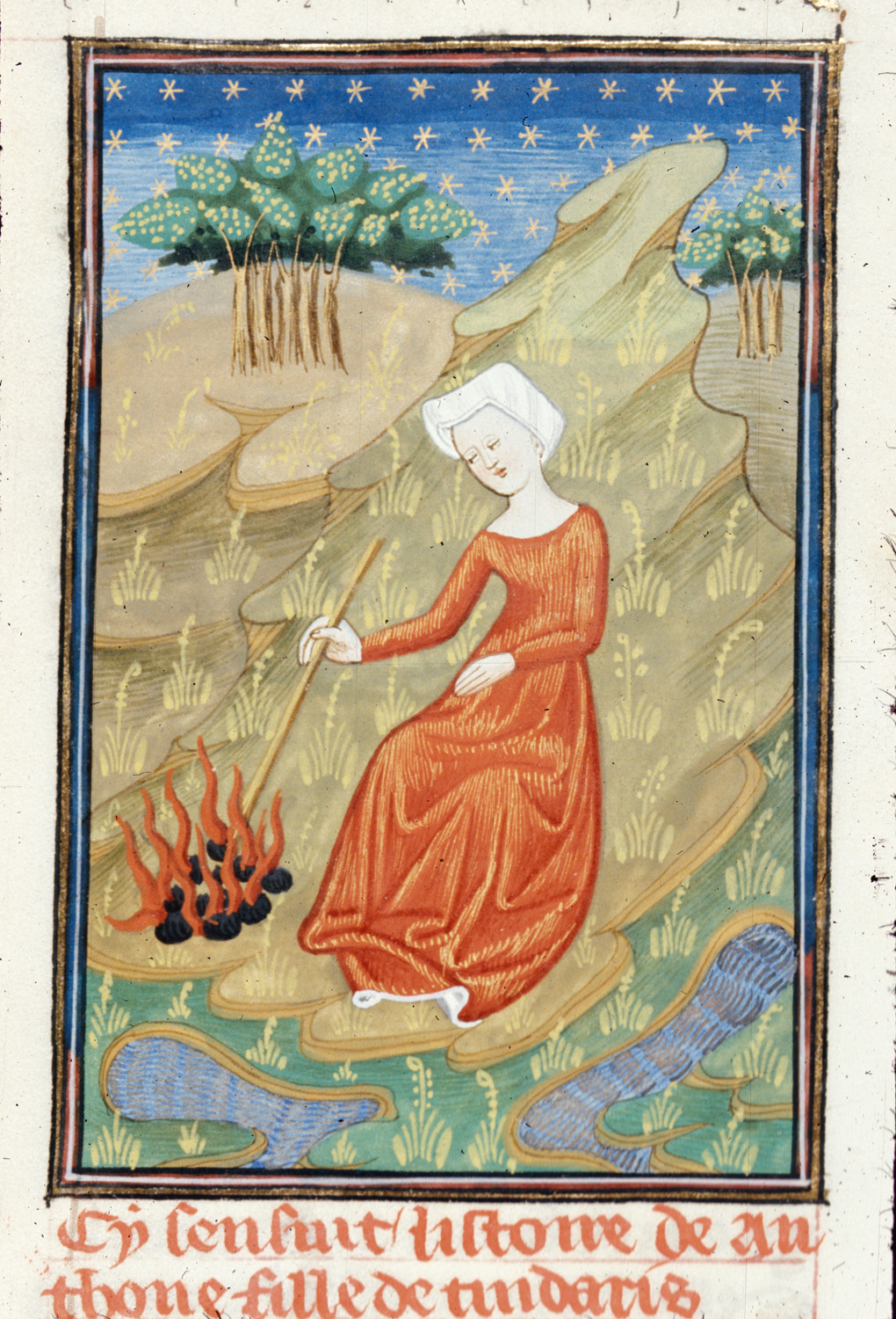 Londra, British Library, Royal 16 G V, f. 33r. L'indovina Manto attizza un fuoco con un bastone.