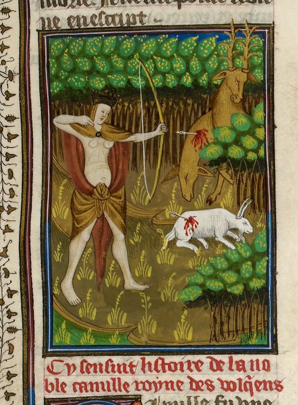 Londra, British Library, Royal 16 G V, f. 44r. Camilla, vestita solo di un mantello, va a caccia di un cervo e una capra con arco e frecce.