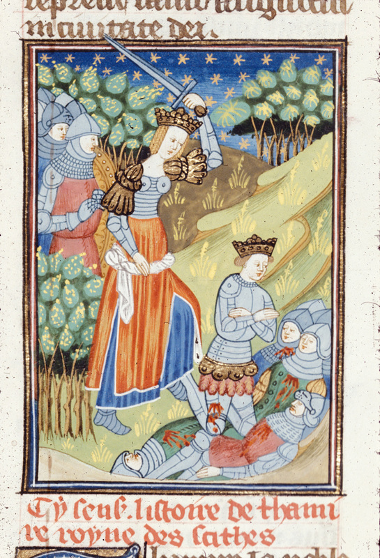 Londra, British Library, Royal 16 G V, f. 59r. Tamiri, regina di Scizia, decapita Ciro sul campo di battaglia.