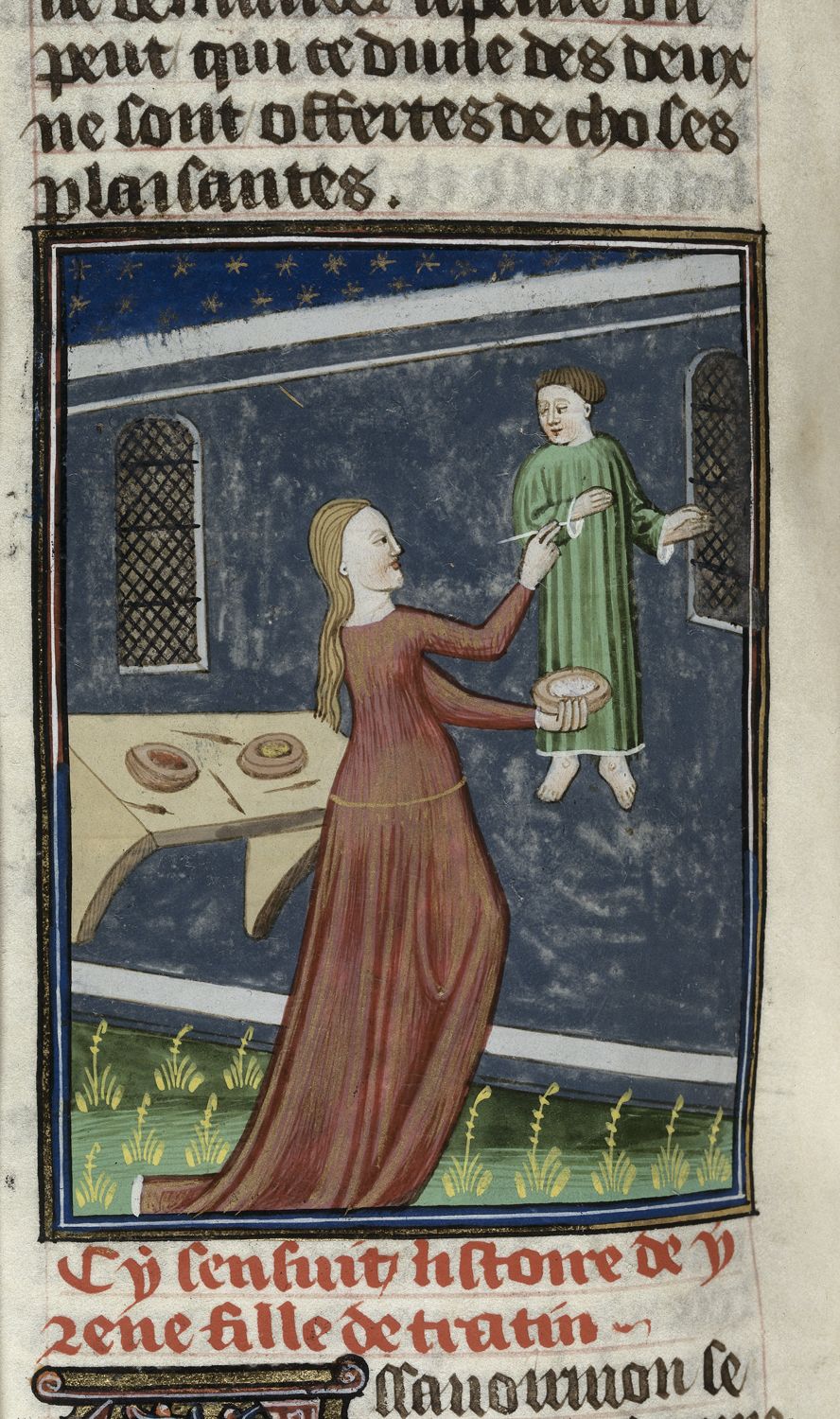 Londra, British Library, Royal 16 G V, f. 73v. Irene dipinge sul muro la figura di un giovane dalla lunga veste verde.