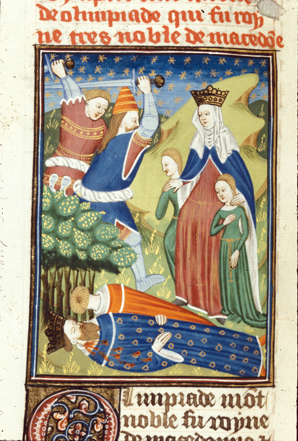 Londra, British Library, Royal 16 G V, f. 74v. Olimpiade, sorretta da due giovani ancelle, accusata di aver assassinato il re Filippo Arrideo affronta i carnefici mandati da Cassandro.