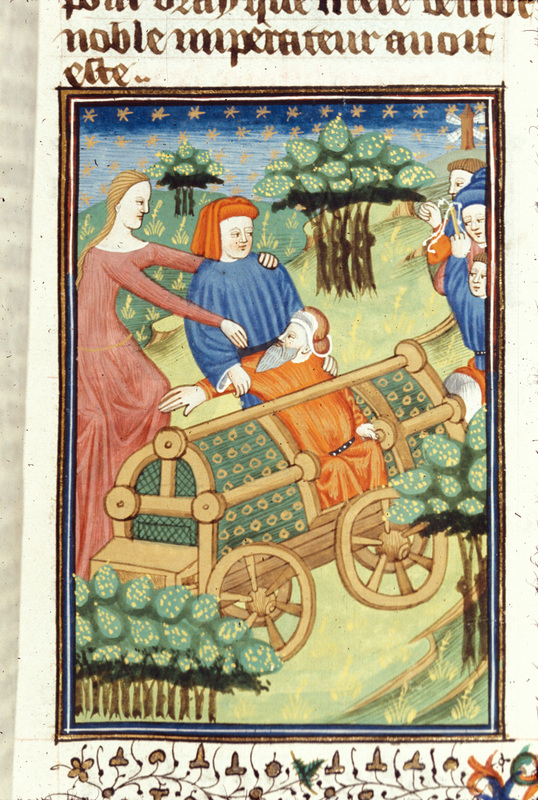 Londra, British Library, Royal 16 G V, f. 76r. Claudia impedisce che suo padre venga gettato giù dal carro trionfale.