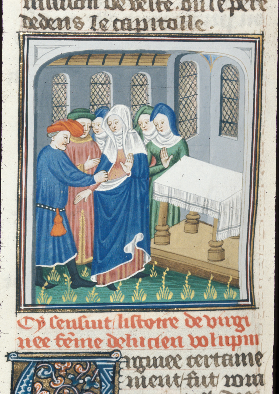 Londra, British Library, Royal 16 G V, f. 76v. Virginia viene assalita da un gruppo di uomini nel tempio della Pudicizia.