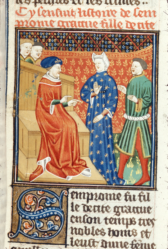 Londra, British Library, Royal 16 G V, f. 90r. Sempronia rifiuta di riconoscere il nipote Lucio Equizio di fronte all'assemblea dei plebei.