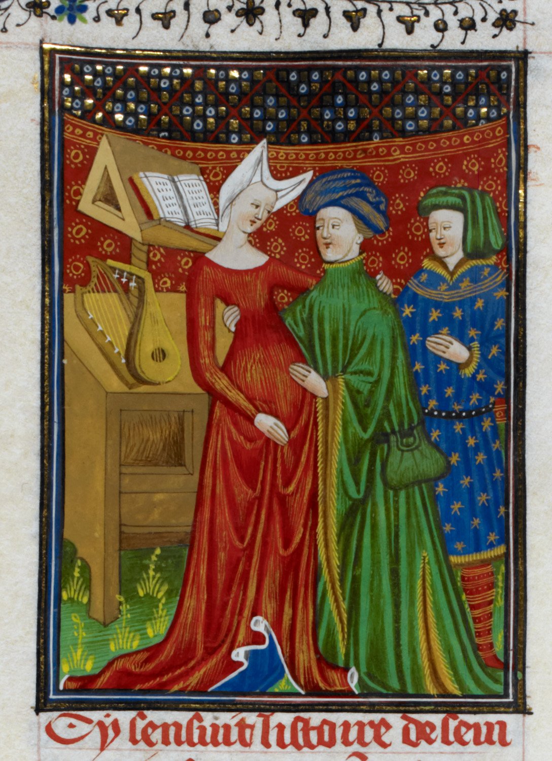 Londra, British Library, Royal 16 G V, f. 93r. Sempronia viene corteggiata da un uomo; accanto ai due si trovano un altro personaggio maschile e un tavolo su cui sono poggiati degli strumenti musicali ed un libro.
