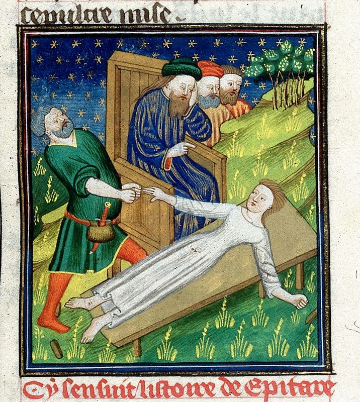 Londra, British Library, Royal 16 G V, f. 109r. Epicari viene torturata per aver preso parte alla congiura contro Nerone.